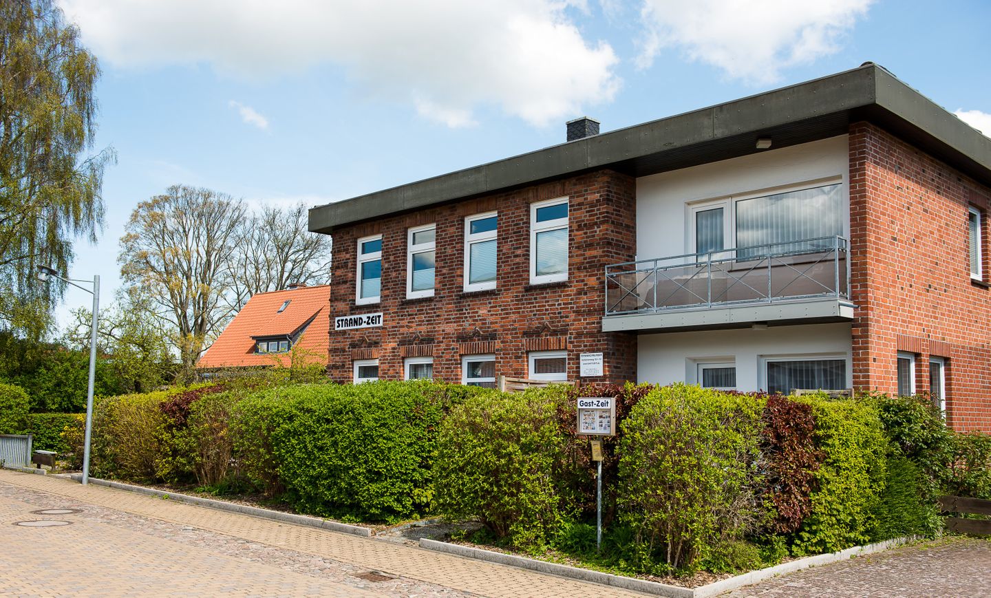 Das Haus STRAND-ZEIT in Kellenhusen liegt mit ca. 200 m Entfernung ziemlich mittig zwischen Strand und Wald an einer Wohnstraße. Es beherbergt 5 Ferienwohnungen.