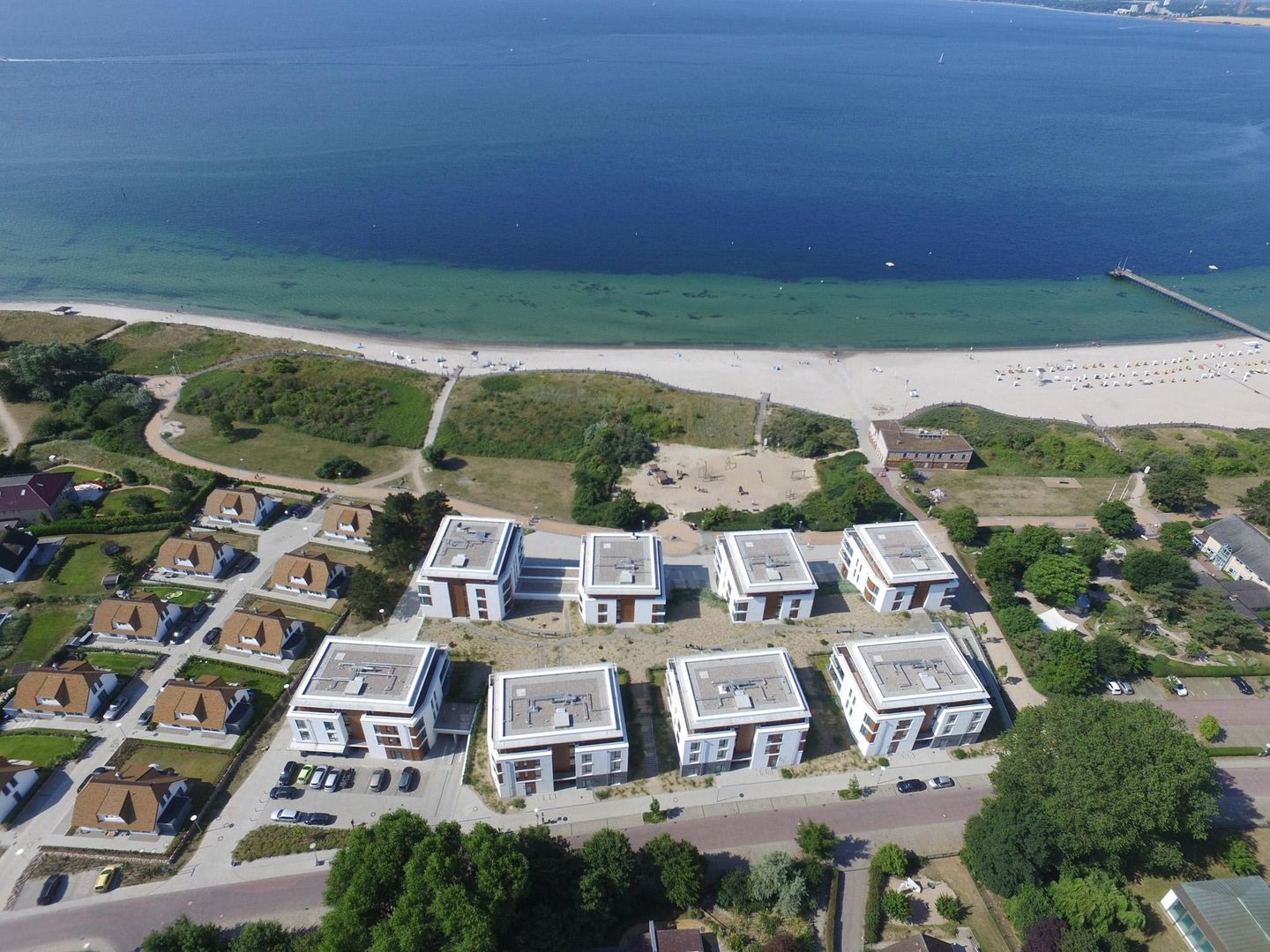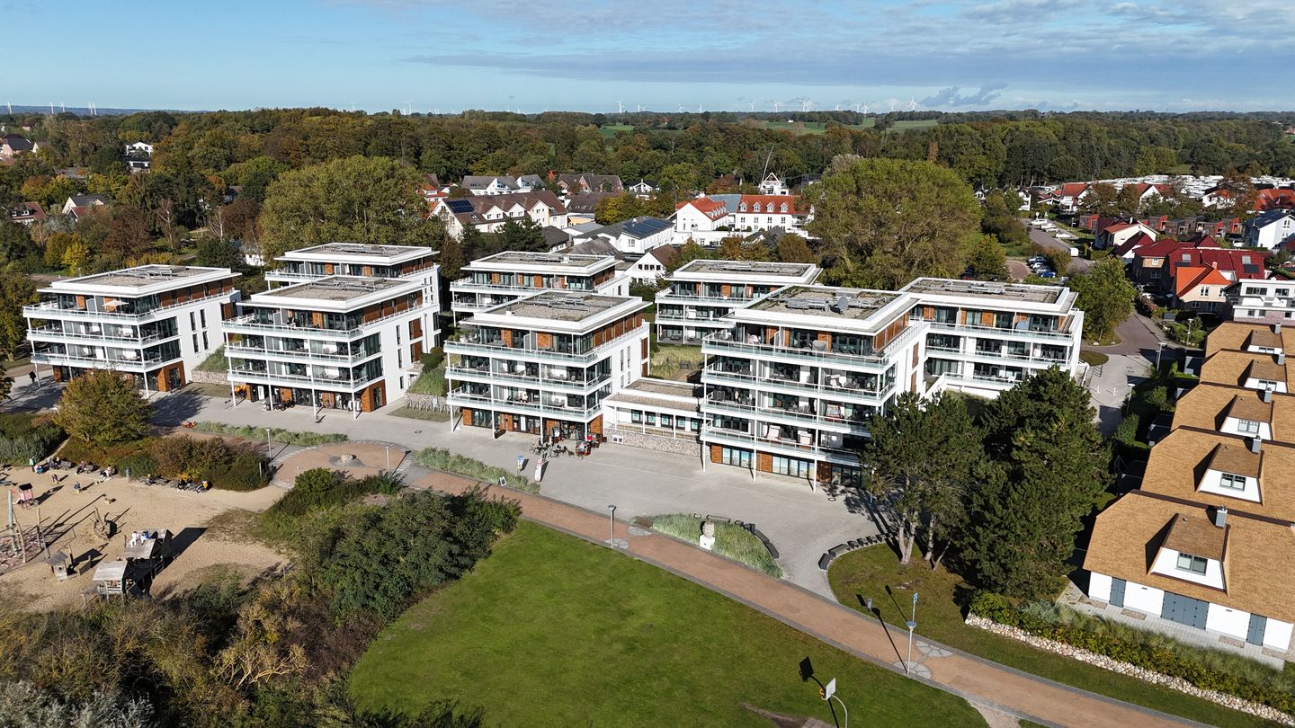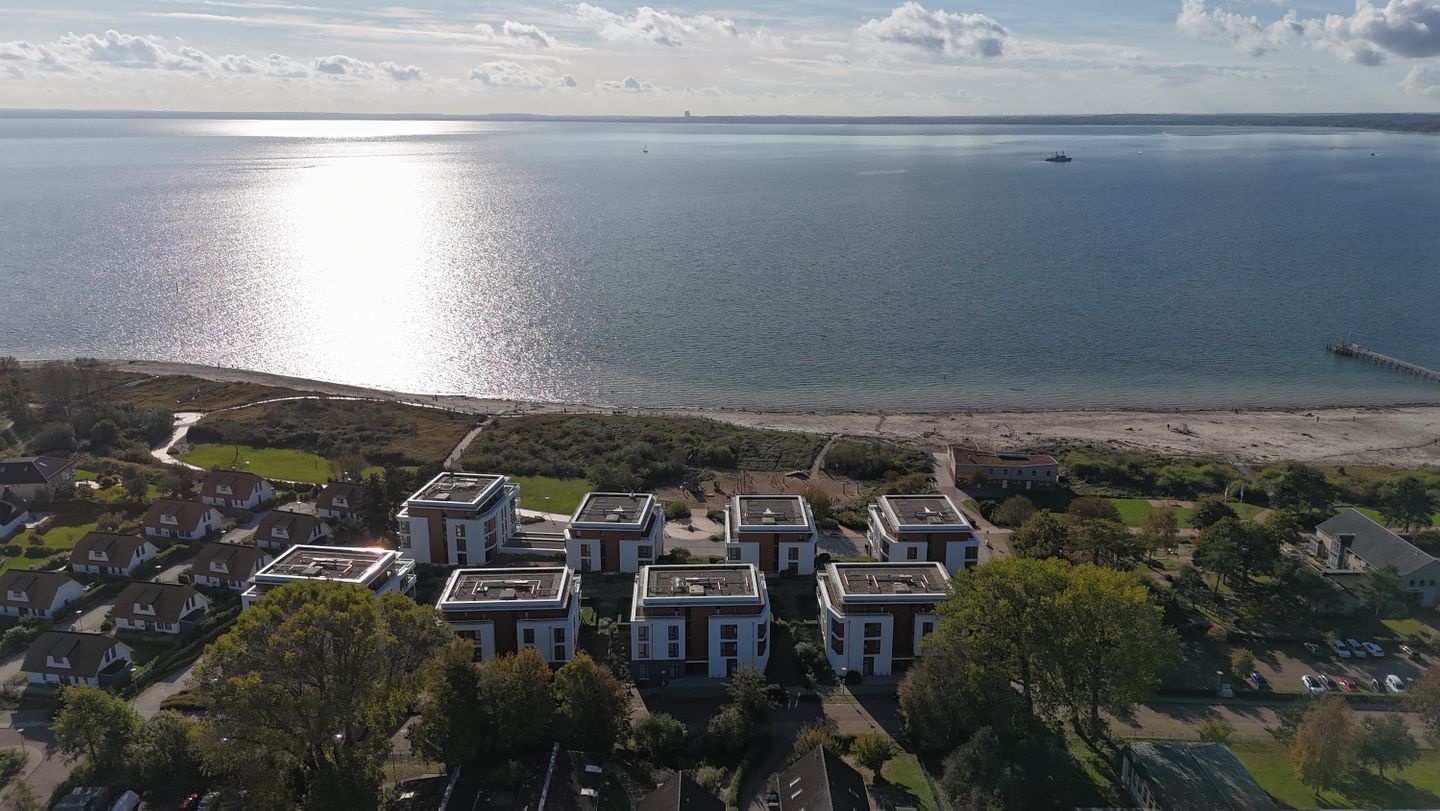 Alle Wohnungen haben große Terrassen/Balkone mit direktem oder eingeschränktem Meerblick. Jedes Haus verfügt über einen Aufzug, mit dem man barrierefrei direkt aus der Tiefgarage zu seiner Wohnung gelangen kann.